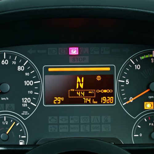 The LED panel makes all vital information easily visible. The Trip Mileage Indicator shows distance traveled, average speed, and fuel consumed. Variable green band indicator shows the driver the gear and speed required to minimize fuel consumption.